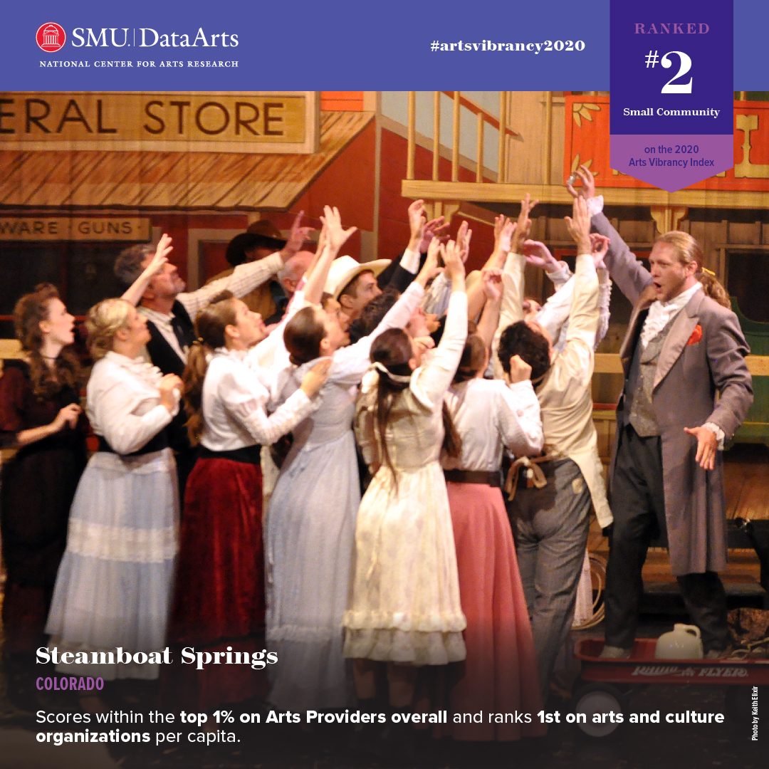 Steamboat Springs, CO, was founded on a love of the arts, from the Ute and Fremont Indigenous peoples who created artwork on rocks and in caves throughout the area to the first white homesteaders – the Crawford family, who brought paints and an organ when they first arrived. In 1915, Perry-Mansfield Performing Arts School and Camp opened permanently in Strawberry Park and has brought national renown to the area. Today, Steamboat Springs is thriving with arts and culture from art galleries, opera, music, dance, theater, distilleries, breweries, and unique architecture and design. This community ranks 1st in arts and cultural organizations and 4th on independent artists per capita. Through its evolution from a rural community to a nationally recognized outdoor recreation destination, Steamboat Springs has stayed true to its heritage through infusing cultural design elements in its city planning, recognition and celebration of its roots, and continual expansion of arts and culture. Steamboat was the first Certified Colorado Creative District to have multiple satellite locations, which extend beyond downtown Steamboat. Strings Music Festival and Perry-Mansfield Performing Arts School & Camp are the two largest arts organizations in the community, bringing visitors from across the country. There are also numerous smaller nonprofit arts organizations that deliver big impact to the community and its visitors, including Opera Steamboat, Yampa Valley Choral Society, Piknik Theatre, Steamboat Symphony Orchestra, Chief Theater, Elevation Dance, Steamboat Dance Theatre, Steamboat Art Museum, Tread of Pioneers Museum, over 15 art galleries, and 75 published authors. Steamboat Springs is strong in dance, visual arts, heritage, music, writing, design, and opera. The majority of professional artists tend to be over the age of 40, but there are also younger, emerging artists. Despite low rankings on state and federal Government Support, there is strong financial support from the community through memberships, donors, and sponsors. Over the past five years, the city and chamber have become increasingly supportive of arts and culture, thanks in part to a better understanding of the economic impact that the arts have on the community.