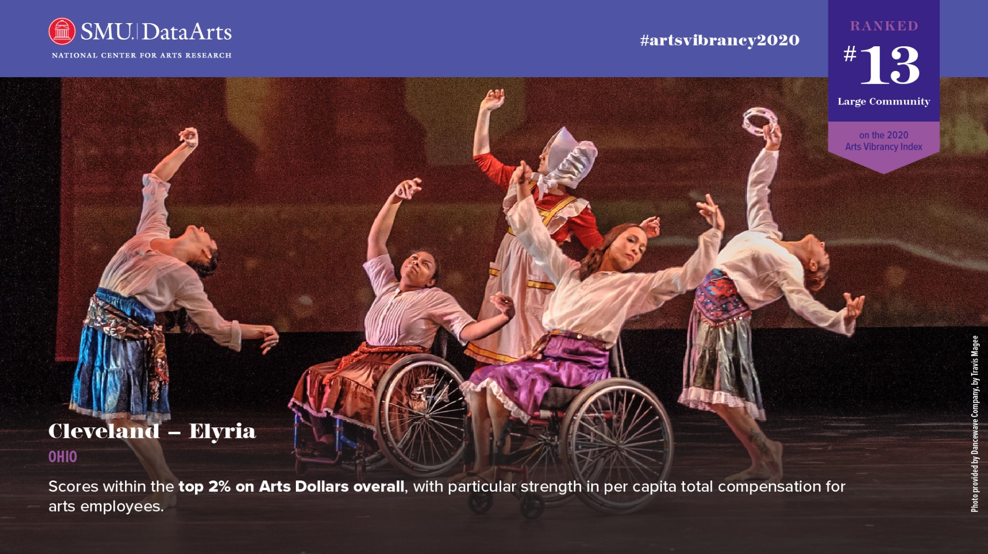 Here you will find details and profiles on the top 20 arts-vibrant communities with population of 1,000,000 or more. The rankings on the metrics and measures range from a high of 1 to a low of 947 since there are 947 unique MSAs and Metro Divisions. We offer insights into each community’s arts and cultural scene and report rankings for Arts Providers, Arts Dollars, and Government Support, as well as the rankings of the underlying measures.