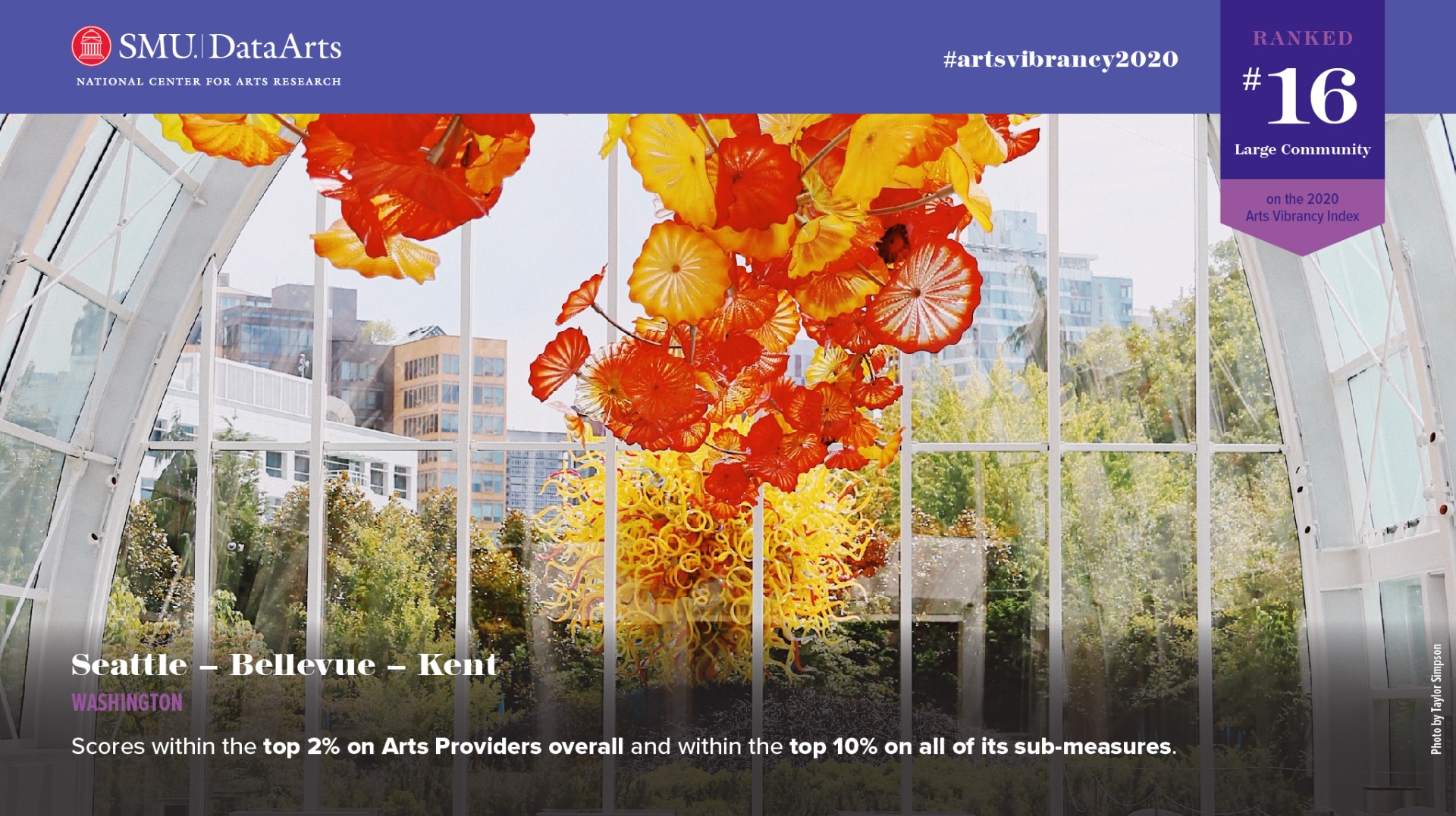 Art is viewed as essential in the Seattle, WA, MSA, and it is integrated into daily life. Whether as artist-designed manhole covers and public art for new construction, or the Seattle Department of Transportation’s official “Art Plan,” bringing beauty and art to the streets of Seattle is high priority for city officials. It has large, established institutions that tend to be clustered in two neighborhoods: Downtown and the Seattle Center. Seattle has a large ecosystem of smaller arts organizations that exist in every genre, in just about every neighborhood, and in four official arts and cultural districts: Capitol Hill, Central Area, Uptown, and Columbia/Hillman City. Seattle boasts more than 140 producing theater companies. It has been recognized nationally and internationally for leadership and innovation in theater, music, glass art, and literary arts. It is one of only a handful of U.S. cities to have a top-tier symphony, ballet, and opera, and it has been designated a City of Literature in UNESCO’s Creative Cities Network. The city’s Office of Arts & Culture is a cabinet-level department that is supported by a dedicated revenue stream and, at the county level, 4Culture provides critical funding for the arts, public art, heritage, and historic preservation. Seattle citizens use art and culture to preserve the environment as well, through festivals and art installations dedicated to appreciating and saving Seattle’s natural beauty. Innovative organizations like Shunpike provide emerging, independent artists and small arts organizations with support in the form of critical services, resources, and opportunities to create success. The Office of Arts & Culture recently intensified its commitment to racial equity and social justice. It offered intensive basic training to artists ready to translate their studio or gallery experience into the public realm through “Public Art Boot Camp”; Artists Up, a collaborative effort between the Seattle Office of Arts & Culture, 4Culture, and ArtsWA, serves historically marginalized or underrepresented artists in Washington state; and its CityArtist program continues to support the work of Seattle-based individual artists and curators. Seattle is ranked in the top 2% of communities on Arts Providers, and all of its sub-measures in this area are within the top 10% of all cities. Despite substantial city support and programs that drive the arts and Seattle being among the top 8% of markets for federal arts dollars, per capita state funding in Washington is among the lowest in the nation.